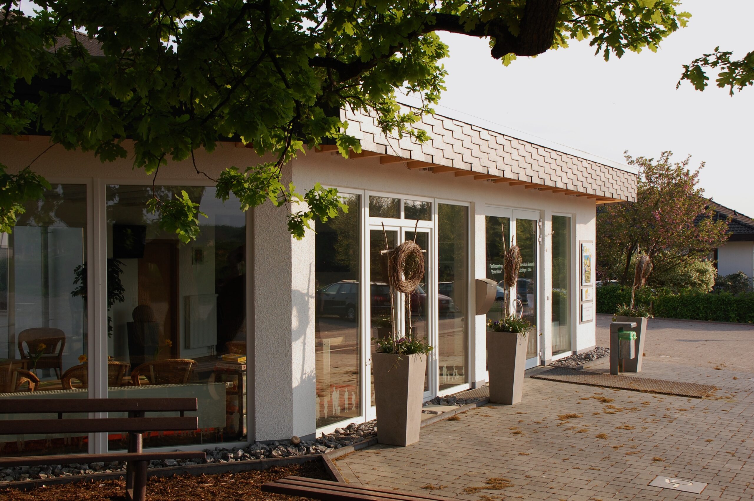 Das Familienzentrum besteht aus fünf Gruppen mit insgesamt 100 Kindern. Die vier Hausgruppen haben einen eigenen Gruppenraum, einen Gruppennebenraum, eine eingebaute Kinderküche und einen Waschraum. Drei Gruppen verfügen für die U3 Kinder über einen Schlafraum. Die Gruppen sind ausgestattet mit einer Puppenecke, einem Bauteppich, einem Lese- und Kuschelbereich, und/oder einer Werkstatt, bzw. Werkbank, einem Experimentiertisch, einem Tisch zum Malen und Basteln und einer Hängematte. Den Kindern steht ein großer Außenbereich zur Verfügung und die Umgebung läd zum Sparzieren und Entdecken ein.